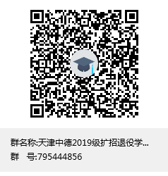 2019级高职扩招录取的退役学生,请于8月31日前实名加入“天津中德2019级扩招退役学生群”,群号795444856,该群主要用于退役军人服务保障相关工作,进群后将昵称改为“姓名+手机号码”,以便通知联系。